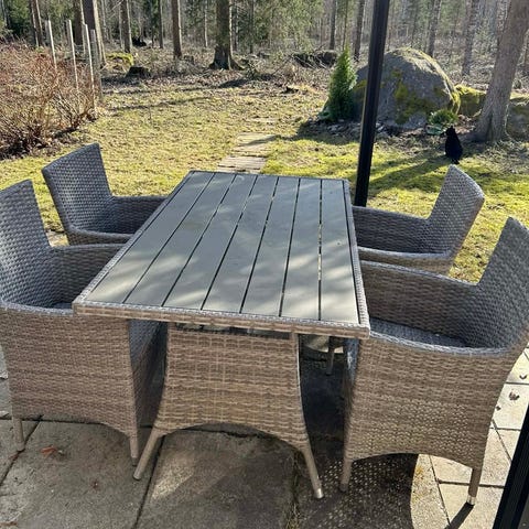 Ruokailuryhmä pöytä ja 4 tuolia polyrottinki harmaa ulkokäyttöön150 €Hollola, Hämeenkoski, Päijät-HämeLisää suosikiksi.