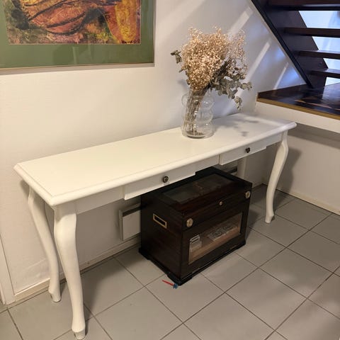 Valkoinen pitkä sivupöytä kahdella laatikolla