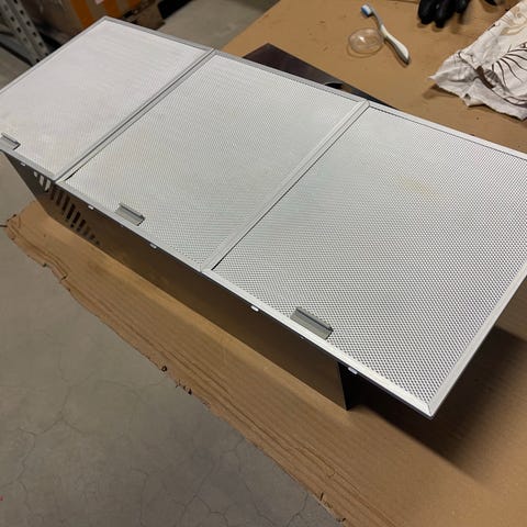 MUH-liesituulettimen ja -kuvun teräsverkkosuodattimia , toisen koko 168 x 320 mm (kuvassa) ja toinen 124 x 315 mm
