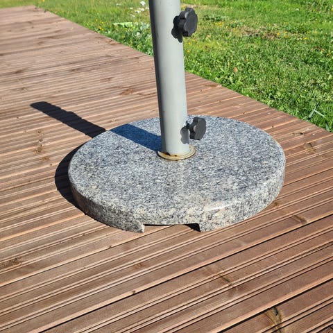 Graniittinen aurinkovarjon jalusta, harmaa väri. Sopii käytettäväksi ulkotiloissa, kuten terassilla tai puutarhassa, varmistamaan aurinkovarjon vakauden tuulisella säällä. Kestävä ja vakaa rakenne.