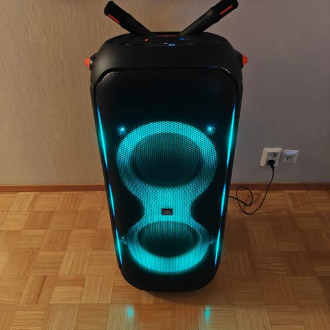 JBL Partybox100 mukana tulee myös jalustat kaiuttimille.