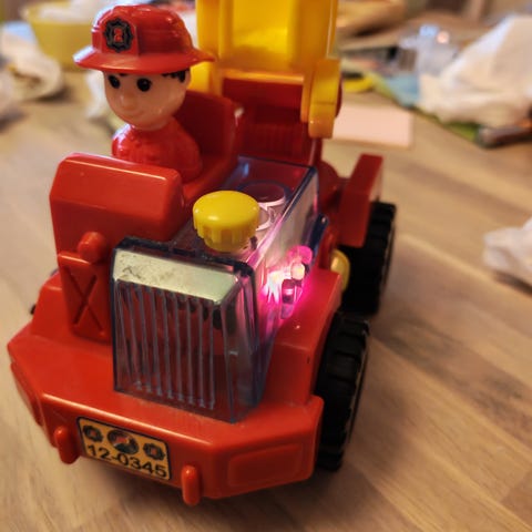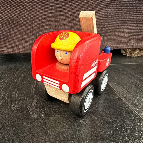 Vanha (1990), muovinen ja punainen paloauto. Oikean puoleinen ovi hieman vääntynyt. Avattava peräluukku ja ovet voi "lukita". Sen voi hakea tai voin lähettää. Pituus n. 33 cm ja korkeus n. 17 cm.