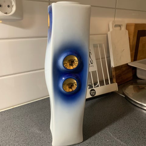 Myydään sininen Monica Backströmin "Moonlanding" - maljakko. Korkeus noin 36 cm ja leveys max. 11 cm.