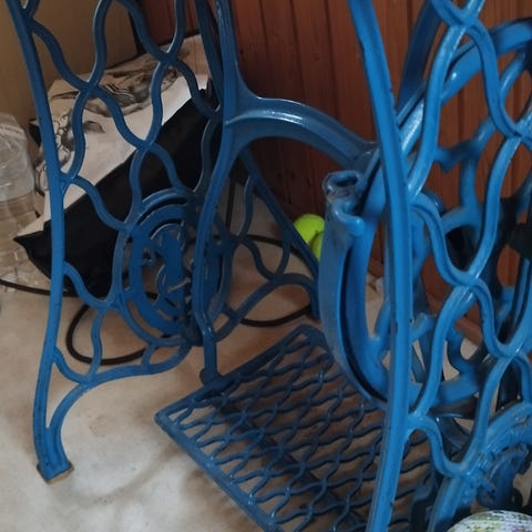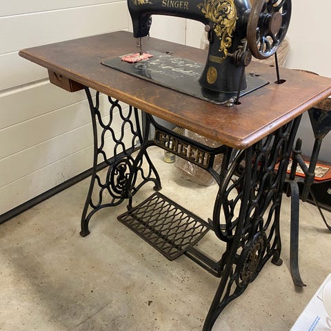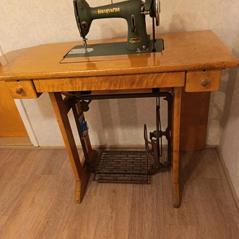 ompelukone puujalustalla ja muut kalusteet