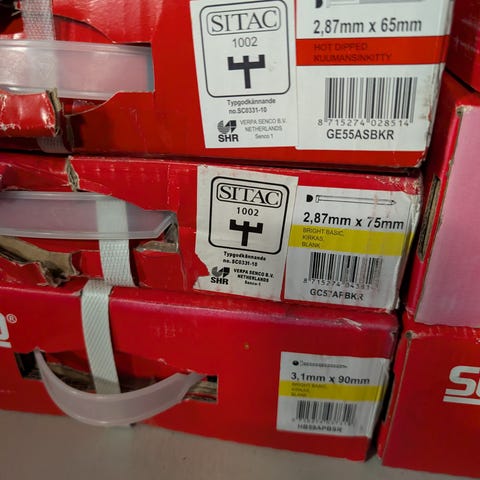21n asteessa olevat Senco-runkonauloja. Kirkas täyskantainen muovisidottu tarranaula.