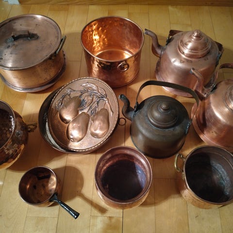 Vanha kuparipannu koko n. K 21 x L 16cm, kansi vinksallaan. Saanee naputeltua takaisin muotoonsa jos haluaa.