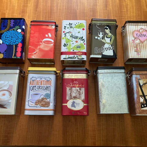 Kuvan kahvi purkkeja 16kpl ja 1 keksi purkki=20€ purkit eri vuosi kymmeniltä. .Myös järkeviä tarjouksia otetaan vastaan kaikista. Miel kaikki yhdessä tai alk 16 kpl ja Mieluimmin nouto. Myös lähetys onnistunee. Tai kaikki yhdessä vain.