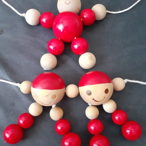 Aarikan vanha vaunulelu, maalikulumaa kohdassa, jossa puupallot ovat toisiaan vastakkain. Käytetty kunto.