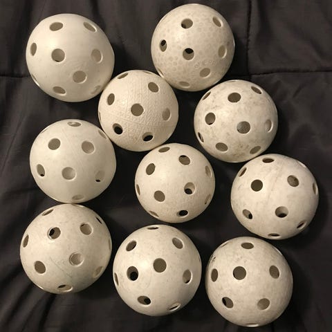 Käyttämättömät 5 sinistä ja 5 keltaista mailaa sekä punainen pallo ensimmäisiin peleihin.