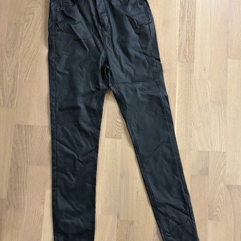 Housut, jotka näyttävät nahkahousuilta, mutta ovat polyesteriä. Joustavaa materiaalia, 6 prosenttia elastaania. Pieni venymäjälki takapuolella. Vyötärön ympärys venyttämättä mitattuna 64 cm. Lahkeen pituus sisäsaumasta n. 65 cm.