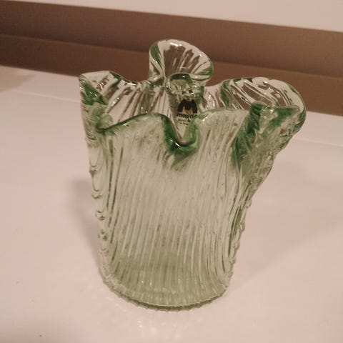 Muurlan hyväkuntoinen kirkas ja ehjä seinämaljakko esim. kukille. Korkeus 22 cm. Leveys 16 cm. Aukko kasveille noin 5,5 cm.