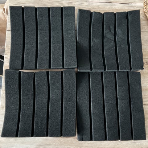 Akustinen tummanharmaa polyuretaanivaahto. Munakennomainen 3d muotoilu keski- ja erityisesti korkeiden taajuuksien ääniaaltojen heijastusten vähentämiseen ja ehkä vaimentamiseen. Kiinnitettävissä liimaamalla, kaksipuoleisella teipillä tai paikalleen kiilaamalla.