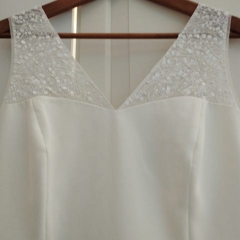 Edessä puolipitkä slitz. Kiinniommellut rusetit hartioilla (ei voi säätää pituutta). Valmiiksi ommellut rintaliivityynyt, saa helposti poistettua tarvittaessa.