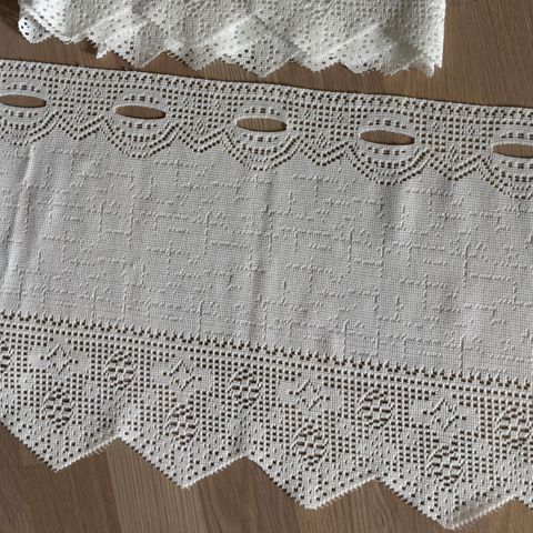 Kuvan käsin painetut kesäiset verhokapat. Koot noin 34x205cm ja 34x80cm. Kunto ok.