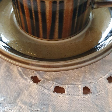 Arabian violetti koko mokkakuppi ja sille lautanen. Kaikki tarrat paikallaan.