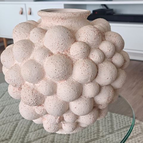 Valkoinen, iso, ehjä maljakko. Pinnassa haaleita, tummia jälkiä, mutta yleisilmeeltään siisti maljakko.