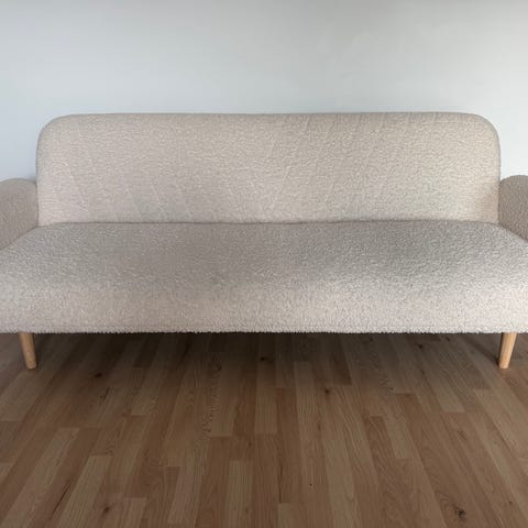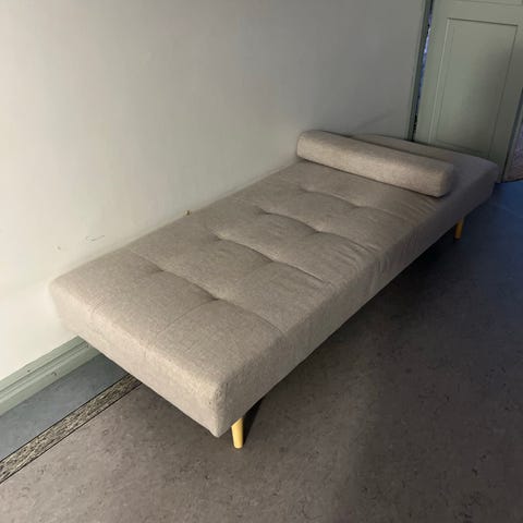 Ellokselta ostettu, joka myy edelleen samaa Daybediä. Sohvapenkki erinomaisessa kunnossa, sillä siinä on päällä säilytetty vierasvara patjoja. Jalkoja on madallettu 5cm ja sävytetty rusehtavaksi.