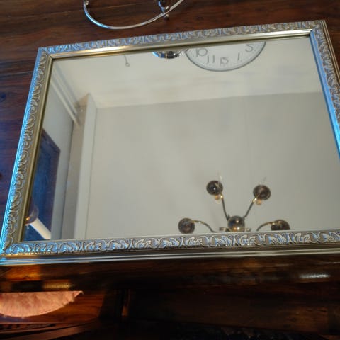Ethän tingi. Kaunis seinäpeili kultaruskealla raamilla 106cm korkea ja 40cm leveä. Ajaa asiansa, on ehjä. Pienen pieniä kulumisen jälkiä reunoissa mutta helppo tuunata pikku vaivalla pois, jos häiritsevät.