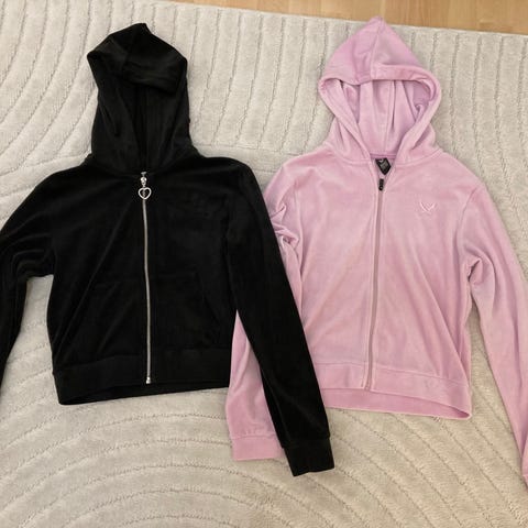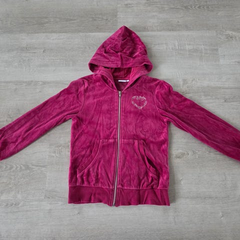 Myydään vaaleanpunainen velourhuppari, koko 140 cm. Voin postittaa.