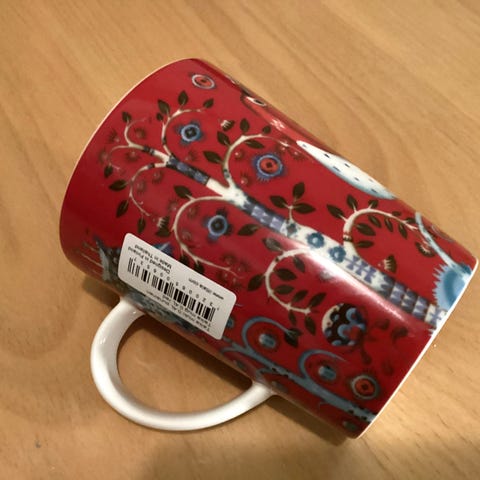 Iittala Taika muki, tilavuus 0,3 litraa, valkoinen väri. Muki on valmistettu keraamisesta materiaalista ja siinä on koristeellinen lintukuviointi.