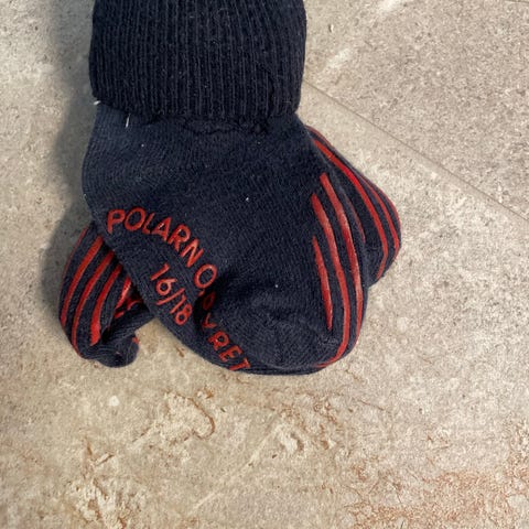 Tarkastamani mukaan ehjät ja tahrattomat. Nimikoimattomat. Hitusen nukkaa pinnasta voi löytää, sukat muuten erinomaisessa kunnossa. Merkki mahdollisesti Polarn O. Pyret tai Name it.