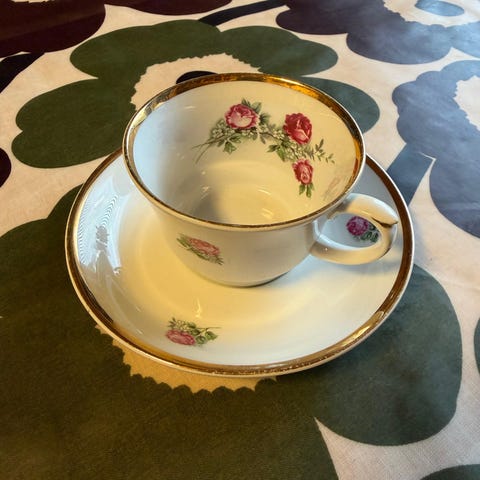 Astiaston materiaali on posliinia, ja se on koristeltu kukkakuvioin. Kannellisissa kulhoissa on kahvat, ja soikea tarjoiluvati 43 x 33 cm. Hinta 20€. Astiaston pohjaväri on vaalea kitti. Nouto Espoon Kaitaalta
