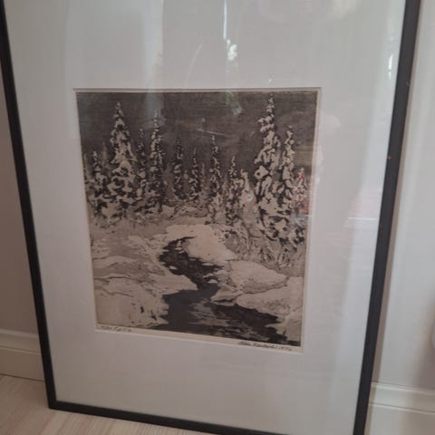 A. Talpon puutyö Tupakeittiö. Työn korkeus on 18 cm ja leveys 27 cm. Kehys 25 X 35 cm.
