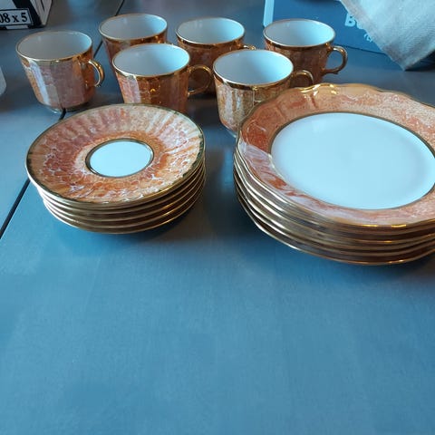 Myydään tämä astiasto kahvikuppisarja hinta yhteensä 50 euroa. Hyväkuntoisia. Vanhat. Valkoinen pohjaväri ja pienet roosa kukat.