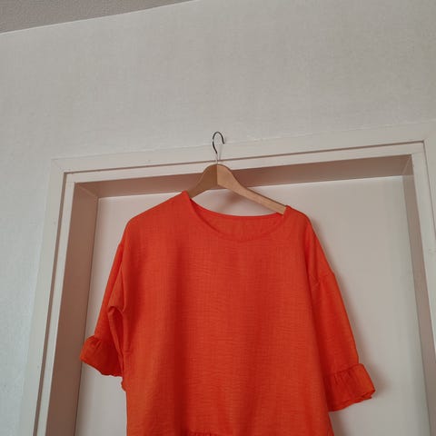 Kerran käytetty ja pesty oranssinpunainen paita kokoa L. Kainalo-kainalo noin 47 cm ja olka-helma noin 57 cm. Hihat eivät ole ihan täysmittaiset.