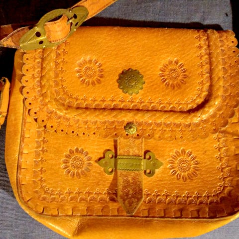 Ruskea vintage käsilaukku nahkaa 1970-luvulta. Mitat n. 26 cm x 15 cm x 12 cm. Sisäpuolella vähäistä käytönjälkeä.