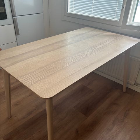 Painava, laadukas ISKUN ruokapöytä. Pidetty päällä pleksiä, jonka saa halutessaan mukaan. Hieman hiertymää pinnassa, ja jaloissa osumaa.