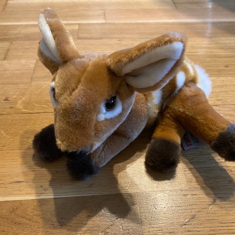 Pehmolelu peura, valmistettu punaisesta kankaasta. Koristeessa on perinteinen muotoilu Peuran pituus on noin 30 cm, ja se on suunniteltu ripustettavaksi. Materiaali on pehmeää ja kestävää, mikä tekee siitä pitkäikäisen lelun