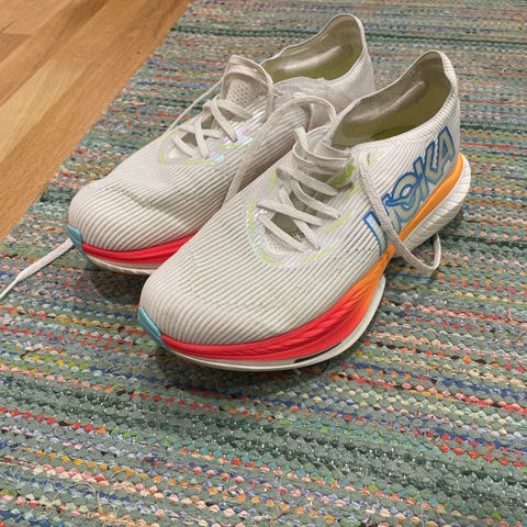 Myyntiin kahdesti kokeillut huippuhyvät ja tyylikkään kisakireät HOKA CIELO X1 juoksukengät, sopii asfaltille ja korkean vaatimustason juoksijalle erinomaisesti. Näillä juostu n. 30 km eli ihan matkansa alussa vasta. Nauhat napakat eikä löysty. Koko 40 2/3, Hokalla normaalisti tarvinnut koon tai vähän enemmän lisää kokoa omaan kokoon verraten (oma koko 39-40). Kenkien ovh. 279€ eli nyt hyvällä alella seuraavalle!
