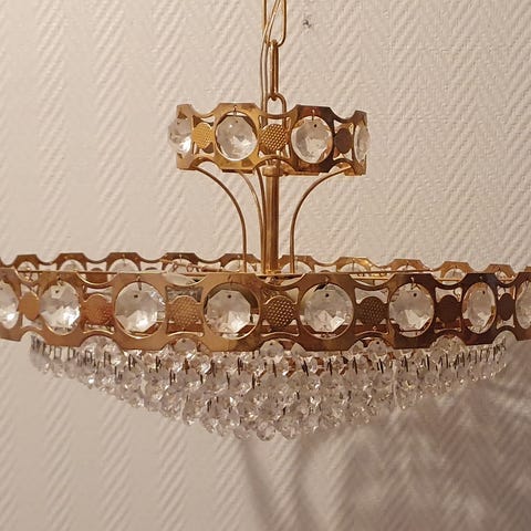 Kuvan mukainen vanha valaisin. Kaikki roikkuvat osat eivät ole tallella. Ei ole ollut hetkeen käytössä, joten ei varmuutta toiminnasta.