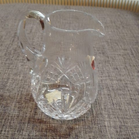Uusi kermakannu kristallia korkeus 13 cm leveys 8 cm suuaukon leveys 4,5 cm virheetön hinta 5e