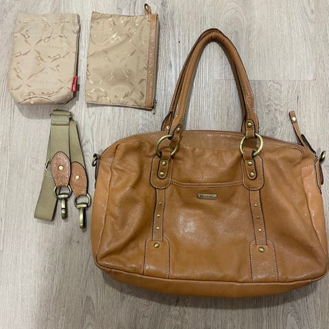Myyntiin yhden lapsen kanssa käytetty vaaleanruskea kaunis Storksak laukku tarvikkeineen. Laukku on aitoa nahkaa.