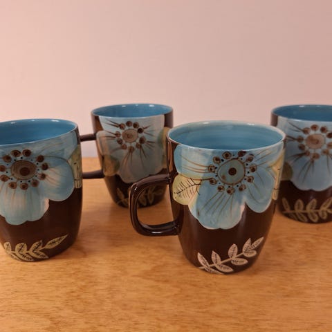 Jätti muki ja neljä kulhoa/ruukkua.