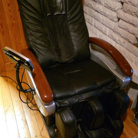 Vanha, arviolta - 90 luvulta oleva luonnonvalkoinen nahka? Verhoiltu tuoli. Toimii, joskus kestää napin painalluksen meno pidempää, mutta ilmoitusta laadittaessa, oli 15 Min ohjelma käytössä. Lämpenee myös mukavasti. Väri kellastunut. Rullia 6-7 kohdassa. Pinta kulunut ja hilseilee.Koko n. 90x200.selkänoja nousee. TÄMÄ EI OLE MIKÄÄN HIEROJAN TYÖVÄLINE.
