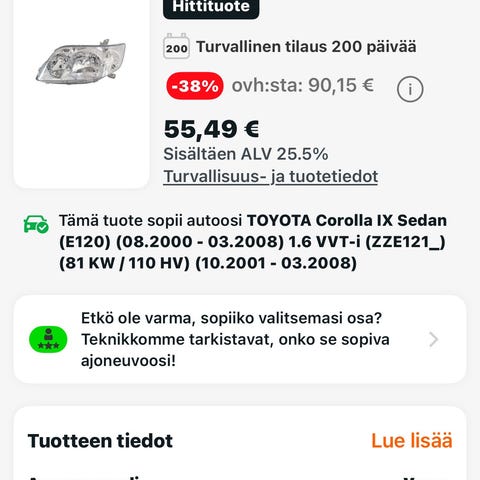 Corolla station wagon E120 (1.6 VVT-i) vesipumppu, moniurahihna, sisäilmafiltteri Toyota IX station wagon farkkuun. Jäi asentamatta, kun meni auto vaihtoon.