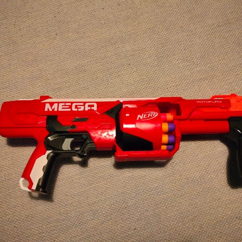 Myydään toimiva Nerf Mega Rotofury, ilman panoksia. Lisätiedot: https://www.muovijalelu.fi/kauppa/lelut-ja-pelit/rooliasut-lapsille/pyssyt-miekat/nerf-mega-rotofury/