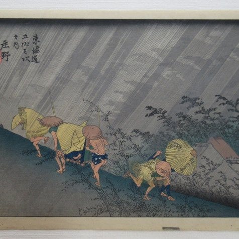 Aito 1840-luvulla printattu puupiirros Hiroshige Andelta. Ostettu galleriasta Japanista. Aitoustodistus ja tiedot taiteilijasta löytyvät. Koko noin a5. Näyttävät liikkeessä teetetyt kehykset.