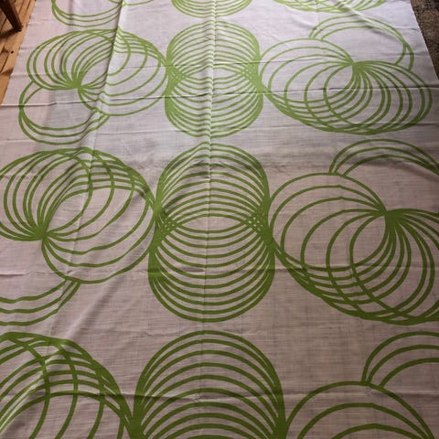 Sinikukkaiset retroverhot. Verhojen mitat: 110 x 183cm. (Nouto tai postituskulut lisätään hintaan).