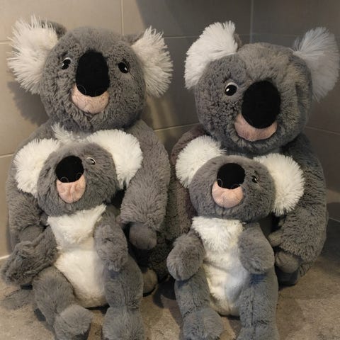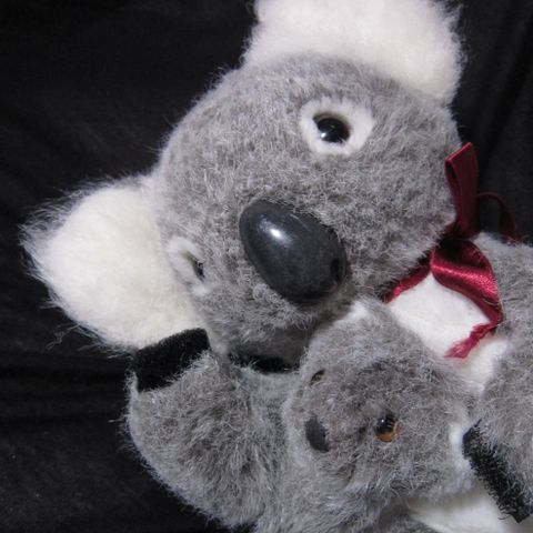 Koalakarhu emo joka halaa poikasta. Tarra kiinnitys käpälien kohdalla. Tämä myös käsinukke pehmolelu. Siisti ja hyväkuntoinen.