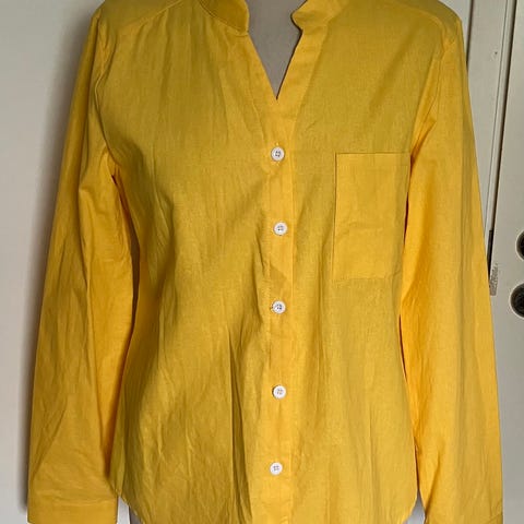 Uusi ohut harsomainen paita jossa napit. Muuten väljä mutta ei mene paksummille käsivarsille. Koko XS-S sen takia. Ei ole pellavaa vaan sen kaltaista.