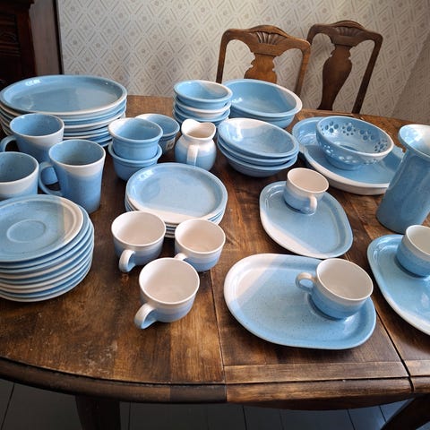 Sinisessä kultakeramiikan astiastossa 21 kahvikuppia, 2 teekuppia, 23 asettia eli aluslautasta.