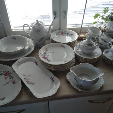 Laaja puolalainen Wawel kultareunainen astiasto, mm. 12 kupin kahvikalusto, samoin matalat ja syvemmät lautaset, tarjoiluvateja monia kokoja, kannuja ym. Lähinnä lautasissa on lieviä käytön jälkiä.