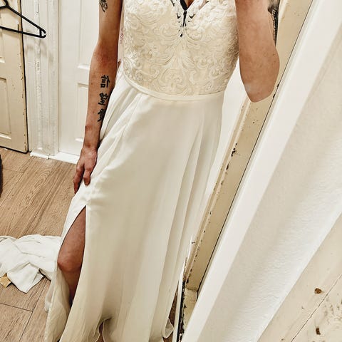 Ysäri häämekko. Tosi pieni. Arviolta koko 32. Pituus n. 100 cm. Mitta kuvassa.