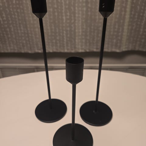 Mustat, sirot metalliset kynttilänjalat. Neljä yksittäistä ja yksi kolmihaarainen. Kaikki yhteensä 15 €.