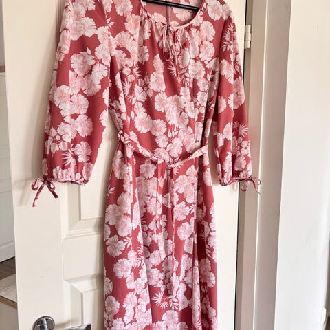 Todella hieno Baum und Pferdgarten merkkinen mekko. Kankaan pohja tummankeltainen, jossa violetteja kukkia. Mekko on kuin uusi, käytetty vain muutaman kerran. 100 % viskoosia, mukana erillinen alushame, jonka saa pienillä nepeillä kiinni olkaimiin. Ohutta kangasta. Mekko menee niin kesällä kuin talvellakin paksujen sukkahousujen kanssa. Väri oikea kahdessa kokokuvassa, kolmas kuva otettu salamalla.