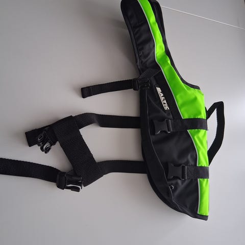 Uimaliivi, helppo käyttää. Meillä ollut käytössä noin 27 kg koiralla.
